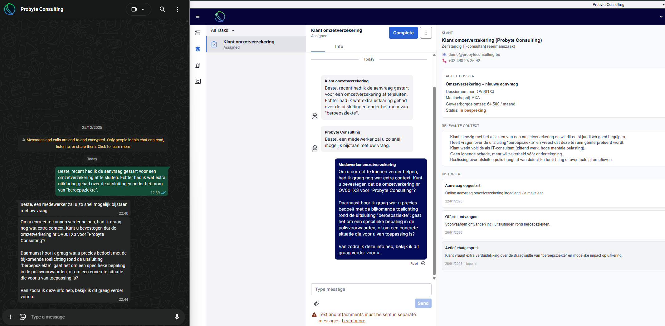 Wanneer een klant water in de kelder heeft staan, een ongeval meemaakt of dringend een schade wil melden, wil die geen e-mail opstellen. Dan wil je snelle, directe communicatie met je verzekeringsmakelaar — net zoals je dat met vrienden of familie doet.